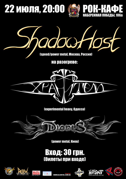 | | 05.02.2006 | Одесса | От Заката До Рассвета | SINFUL (.ru), APOCRYPHAL ( .by), ХРАНИТЕЛИ (Одесса, heavy/power metal), AWOKEN (Черноморск, black/death metal) | Афиша | | 19.02.2006 | Черноморск | Золотой Лев | HIERONYMUS BOSCH, (progressive death, .ru), TRIUMPH (Одесса, death metal), ХРАНИТЕЛИ (Одесса, heavy/power metal) | Афиша | | 22.07.2008 | Днепр | Рок-Кафе (Днепр) | SHADOW HOST (Россия), DIONIS (Киев, power metal), ХРАНИТЕЛИ (Одесса, heavy/power metal) | Афиша | | 26.12.2008 | Одесса | XXI Век | БОНИ НЕМ (Россия), CONQUEST (Киев/Харьков, speed/power metal), КОМА (Россия), ХРАНИТЕЛИ (Одесса, heavy/power metal), SPIRITZ | Афиша | | 26.03.2009 | Черноморск | Золотой Лев | HELL:ON (Запорожье, thrash metal), FRAGILE ART (Россия), ХРОНИКА (Ильичевск, sci-fi metal), ХРАНИТЕЛИ (Одесса, heavy/power metal), SIDE OF SILENCE (Ильичёвск, metalcore), КОНТРОЛЬ ЗЛОСТИ (Одесса, brutal death metal) | Афиша | | 11.07.2009 | Черноморск | Золотой Лев | РЕАНИМАЦИЯ (Одесса, patriotic power metal), ХРАНИТЕЛИ (Одесса, heavy/power metal), WINDRUNNERS (Одесса, heavy/power metal), MY PERSONAL MURDERER (Одесса, depressive metal), FOR SALE | Афиша | | 11.04.2010 | Симферополь | Cobra | ХРАНИТЕЛИ (Одесса, heavy/power metal), EISVOGEL (Севастополь, power metal), SCORCHED, LUNATIC ASYLIUM (Феодосия, thrash metal) | Афиша | | 22.05.2010 | Луганск | Hot Jam | BALFOR (Киев, black/death metal), BRILLIANT COLDNESS (Луганск, death metal), ТЕМНІЧ (Луганск, thrash/black metal), ХРАНИТЕЛИ (Одесса, heavy/power metal) | Афиша | | 01.07.2012 | Одесса | Огни | SOILCORE (Одесса, groove/brutal metal), SUNSTROKE (Одесса, thrash/groove metal), ADVENT FOG (Тирасполь, melodic black metal), ANTIRAIN OF CORPSES (Одесса, crossover thrash/death), INTOXICATED (Киев, brutal death metal), WINDRUNNERS (Одесса, heavy/power metal), ХРАНИТЕЛИ (Одесса, heavy/power metal), INKOGNITUM (Запорожье, dark metal), VENDOGARD (Хмельницкий, black metal) | Афиша | | 28.10.2012 | Черноморск | Метрополис | INFECTED RAIN (Кишинев, alternative/nu metal), GRIMOFF (Николаев, hard'n'heavy), SVIN KILLER (Симферополь, grindcore), ХРАНИТЕЛИ (Одесса, heavy/power metal), ROAD ROY (Одесса, thrash metal) | Афиша | | 10.11.2012 | Одесса | Огни | UNGRACE (Запорожье, industrial death/groove metal), MORIA (Киев, thrashcore/groove metal), ХРАНИТЕЛИ (Одесса, heavy/power metal), SUNSTROKE (Одесса, thrash/groove metal), UNDYING VOICE (Одесса, melodic thrash/groove) | Афиша | Обновлено: 2016-06-13